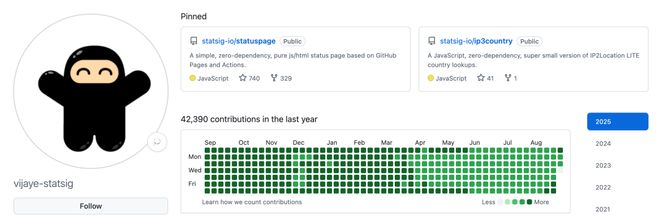 下面是他的Github主页,从绿色方框贡献图来看,他真的太爱编程了,几乎全年无休的写代码。