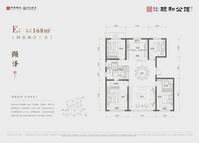 建面约168㎡四居,升级三卫,南向两间卧室均为套房,北向卧室邻近客卫,实现“三套房”的居住体验。客厅面宽约达5.1米,餐厅与客厅等宽,极为罕有地预留出10人圆桌的惊人尺度,整个客餐厅面积约达49㎡,入室门也升级为子母门,便于大件家具进出,在尺度和功能上都呈现出豪宅的居住观感。